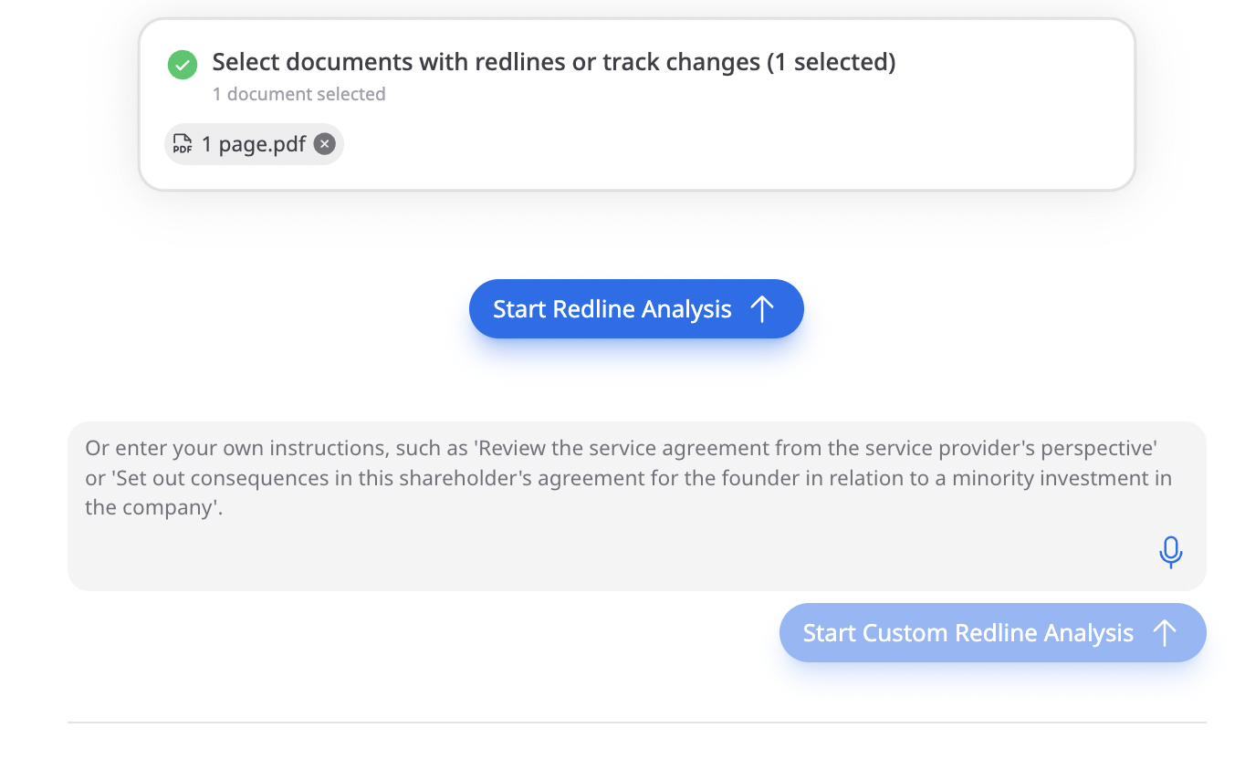 You can add **custom instructions** to guide the analysis, for example, asking the tool to highlight specific risk areas, focus on certain clauses, or flag deviations from your standard templates.&#x20;